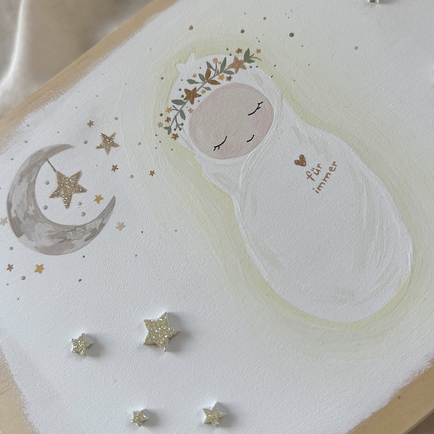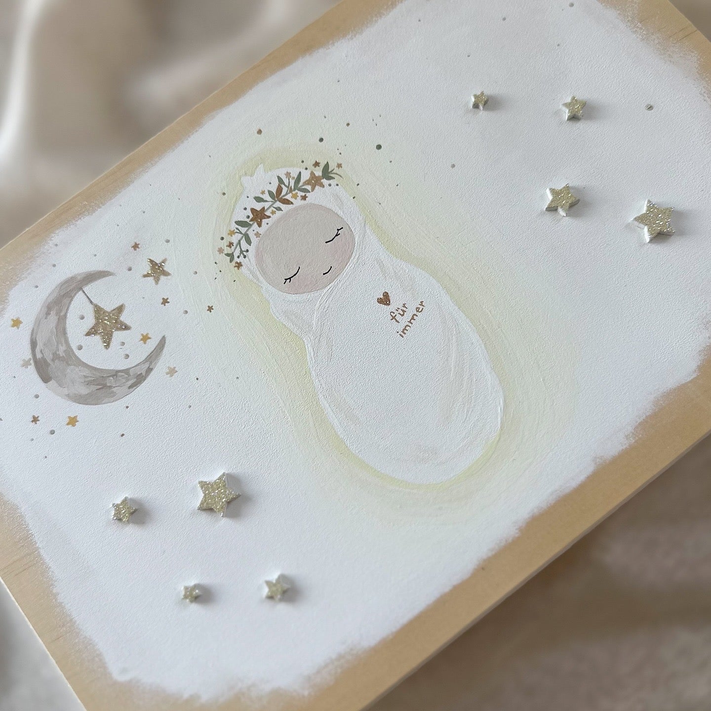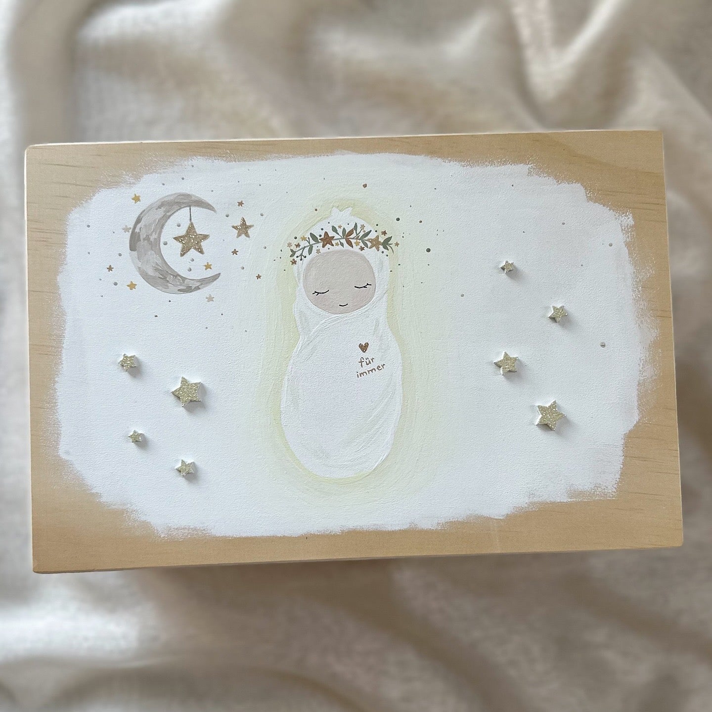 (Bitte beachte, dass all meine Produkte liebevoll per Hand bemalt werden. Dadurch können kleine Abweichungen entstehen – doch gerade diese machen jede einzelne Kiste zu einem einzigartigen Unikat, das mit besonderer Achtsamkeit für eure wertvollen Erinnerungen geschaffen wird.)