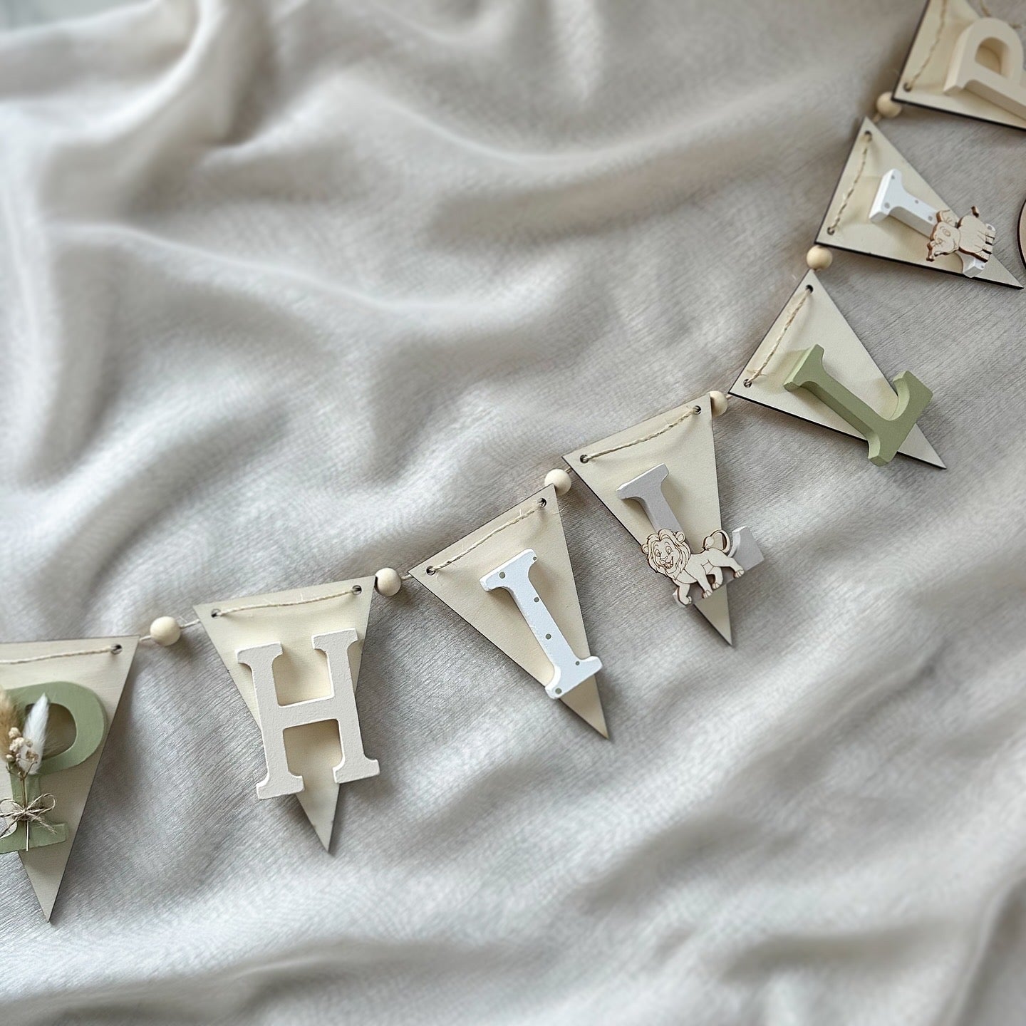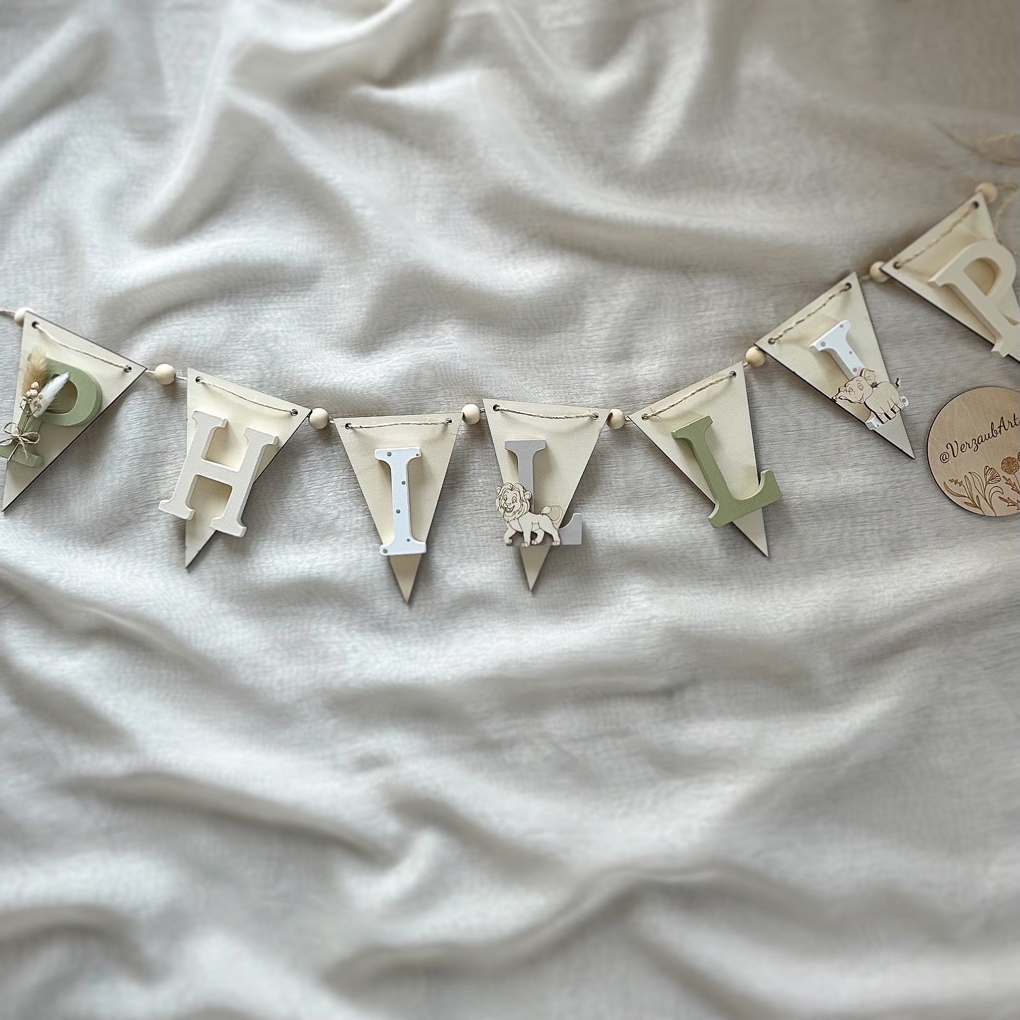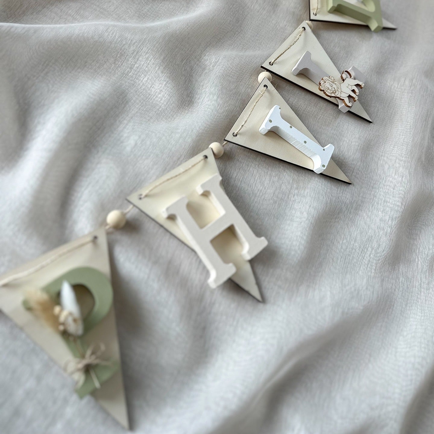 Jedes Detail zählt: Die schlichten Holz-Wimpel harmonieren wunderbar mit den kunstvoll verzierten Buchstaben. Kleine Extras wie liebevoll arrangierte Trockenblumen setzen natürliche Akzente und machen die Kette zu etwas ganz Besonderem.